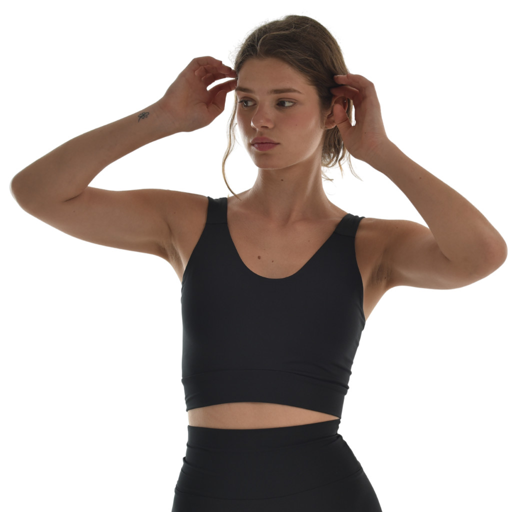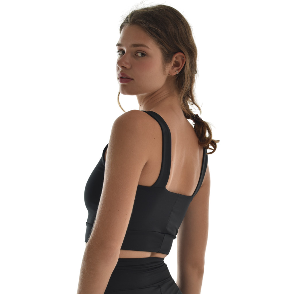 A széles pántok gondoskodnak róla, hogy a mellek súlya egyenletesen oszoljon el, így nem vág be és hosszabb viselés után is komfortos marad. Belebújós sport top fazonja egyszerű és praktikus, edzés közben sem mozdul el.