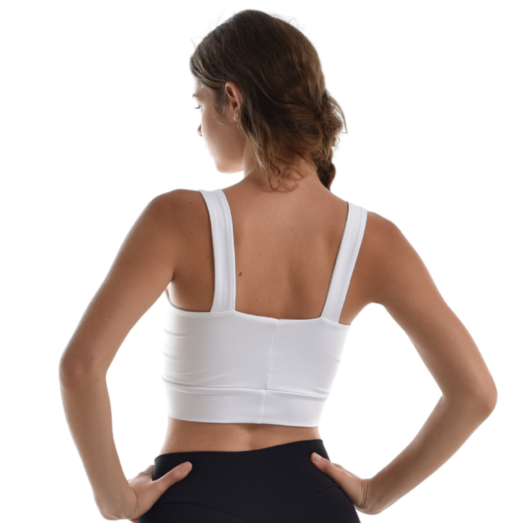 A széles pántok gondoskodnak róla, hogy a mellek súlya egyenletesen oszoljon el, így nem vág be és hosszabb viselés után is komfortos marad. Belebújós sport top fazonja egyszerű és praktikus, edzés közben sem mozdul el.