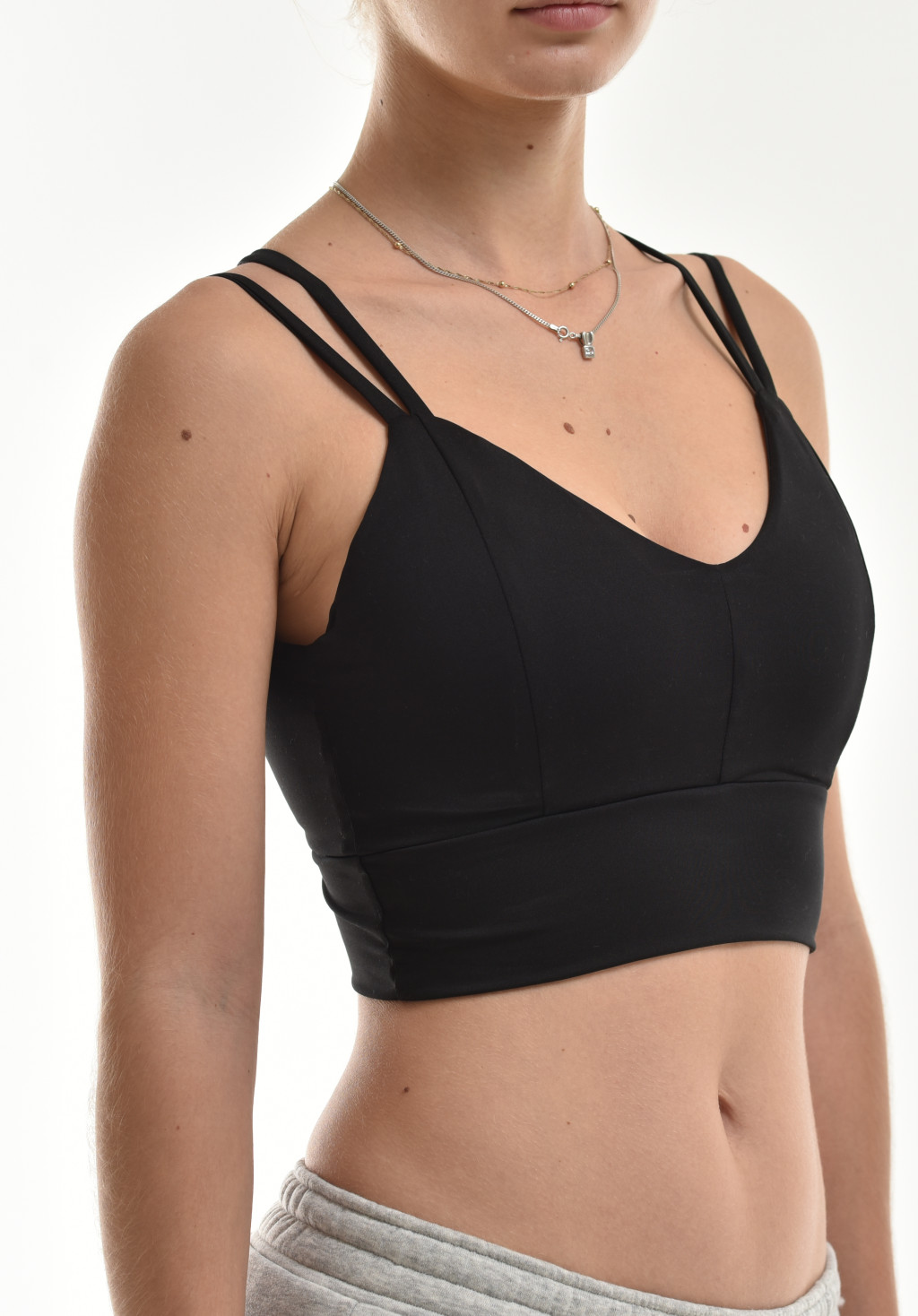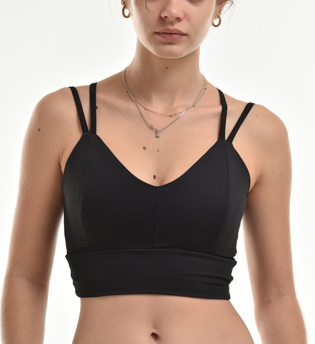 A dupla spagetti vállpántok modern megjelenést kölcsönöznek, és biztosítják a megfelelő tartást. A merevítő nélküli kialakítás és a rugalmas anyag garantálja a maximális kényelmet.