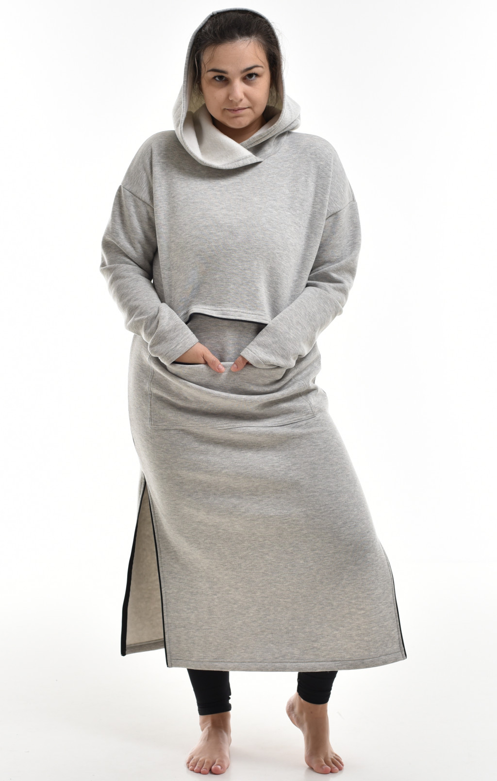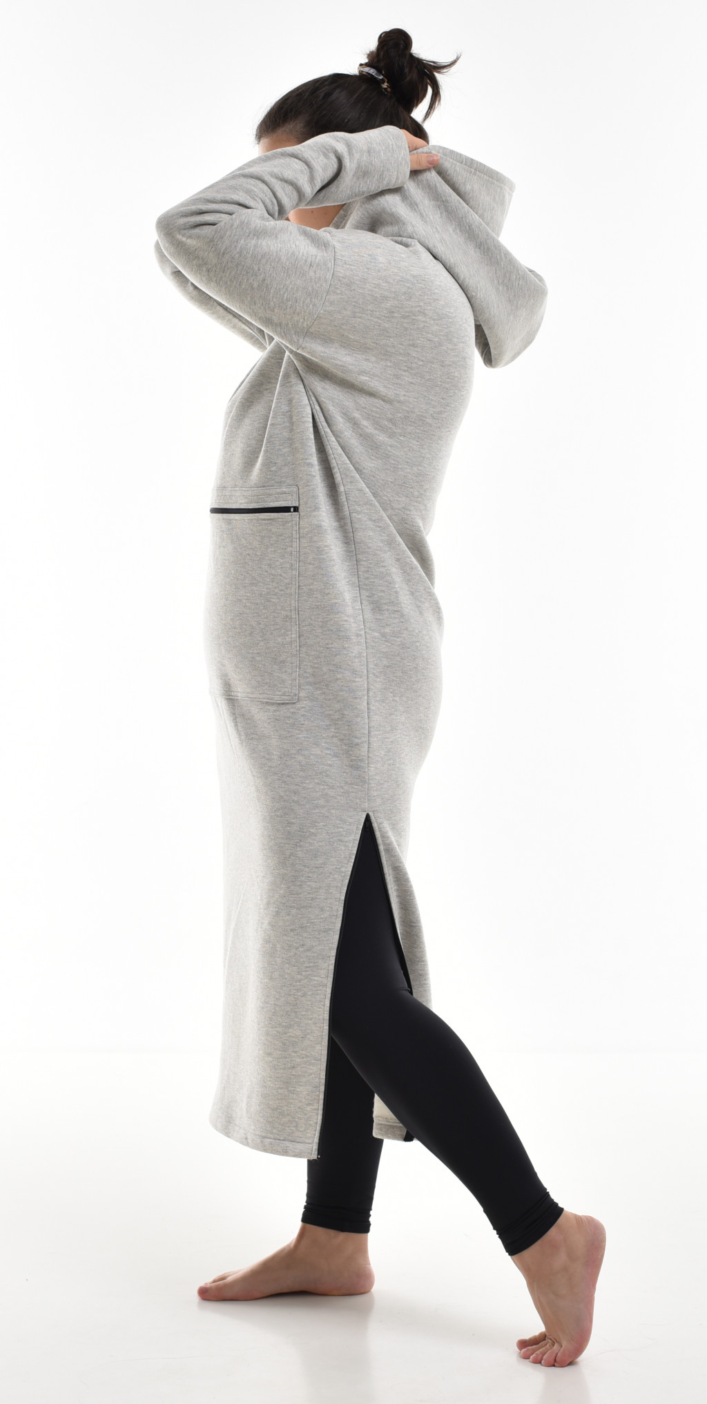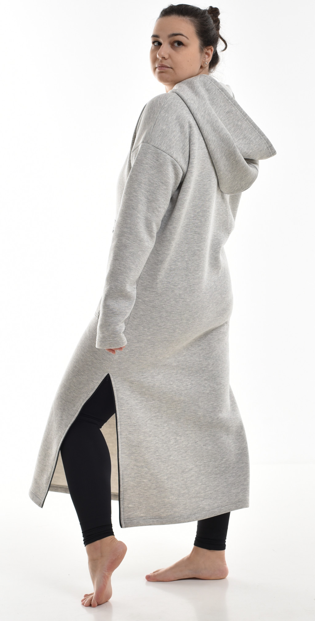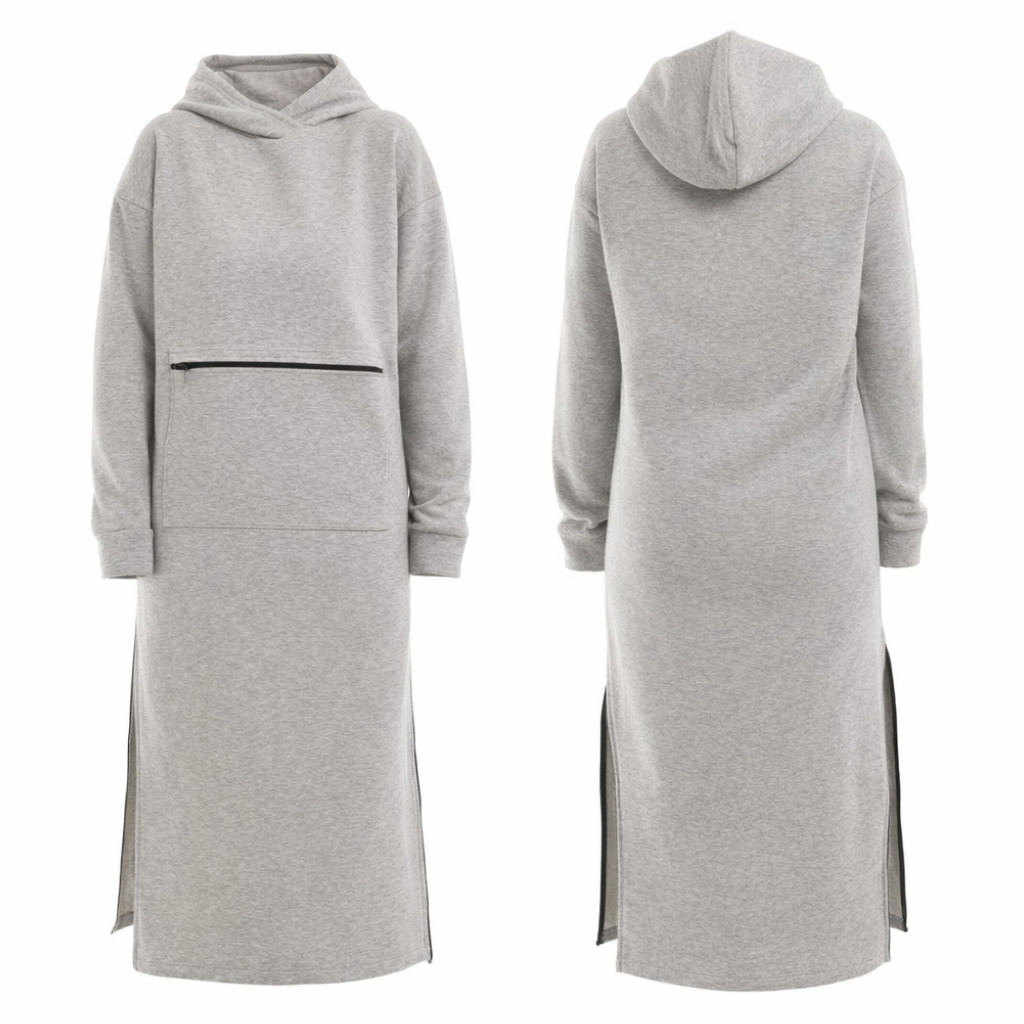 Ez a kapucnis melegítő ruha minden téli nap kötelező darabja. Pihe-puha, vastag anyaga a leghidegebb napokon is melegen tart, így ideális ruha a hidegebb hónapokban. Az oldalsó cipzárak nemcsak praktikusak, hanem egyedi megjelenést is adnak a ruhának. Igazi univerzális ruhadarab a hidegebb hónapokban.Az oldalsó cipzárak segítségével a saját stílusodhoz igazíthatod a ruha oldalsó felvágását, míg az első zseb biztosítja, hogy minden fontos apróság kéznél legyen.